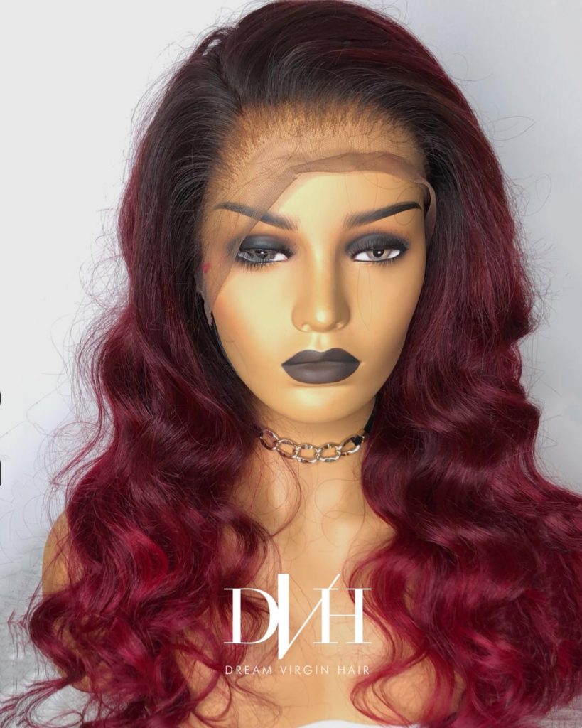 Superbe perruque Lace fontal, cheveux 100% naturels. Finition très naturelle pour un effet perruque indétectable. Couleur : Noir dégradé rouge sur les longueurs.