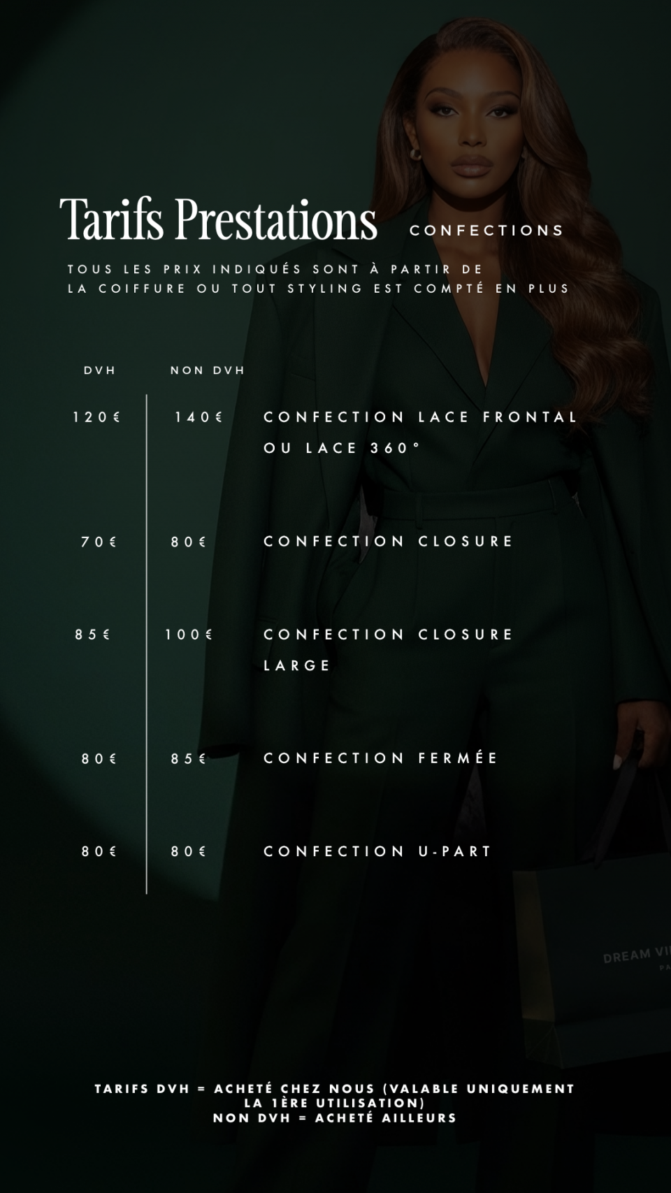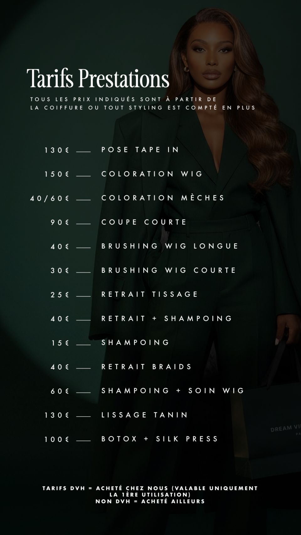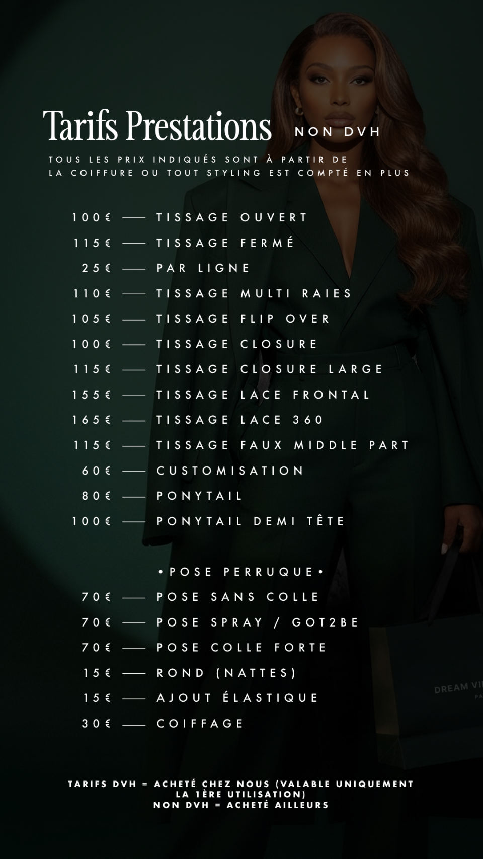 Soyez les bienvenus chez Dream Virgin Hair, votre salon de coiffure spécialisé dans la vente et les poses de tissages, perruques et extensions capillaires à Paris. Sur cette page, vous trouverez l’ensemble de nos prestations et tarifs. Pose tissage Closure, tissage flip over, tissage faux middle part, confection et pose perruques sur mesure, pose d’extensions tape in, colorations … nous sommes là pour réaliser toutes vos envies !